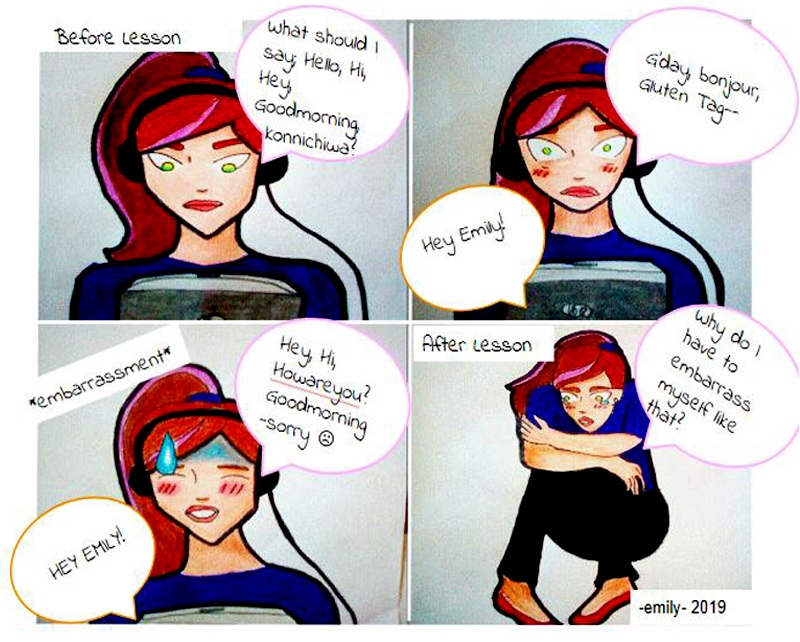 “A few months ago, I wanted to tell my teacher how I feel during the lesson (we were in a well-being lesson and the teachers were telling us that we can tell them of any problem that we are having with class and stuff like that,) and I was like yeah that's a good idea, but then when it came down to sending the email, I just froze, and I felt embarrassed, so I deleted the email. Three months on and it is November (still hadn't told anyone)and I decided that a comic would be the perfect way to tell my teacher how I felt; It combined my art (which helps me calm down, and I get to listen to music which is the best during art.) I came up with the morning greetings that we do, and how I always stuff up in some way, whether it is that my mic is not near my mouth, I stutter, or I'm busy or distracted so I don’t hear my name being called and I feel really embarrassed. I wanted to show this with my drawing. I thought it would be easier to show someone how I felt instead of telling them, because sometimes there are just not enough words to describe the humiliation or embarrassment (I also knew people would relate to it).”